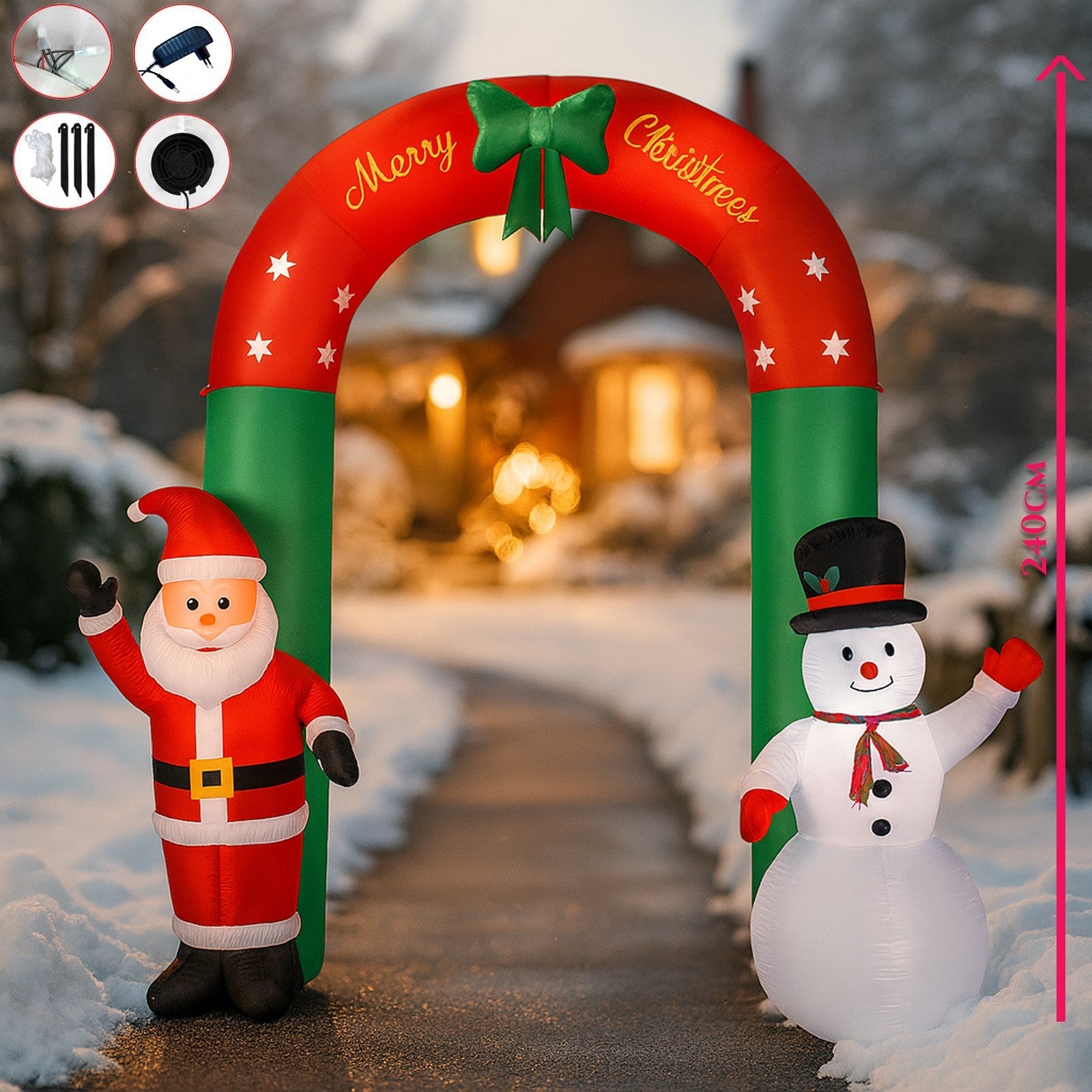 Ovaj prekrasni božićni napuhavajući portal visok 240 cm dolazi s Djed Božićnjakom i Snjegovićem – idealan za dvorišta, terase, ulaze u kuću, trgovine i božićne događaje.