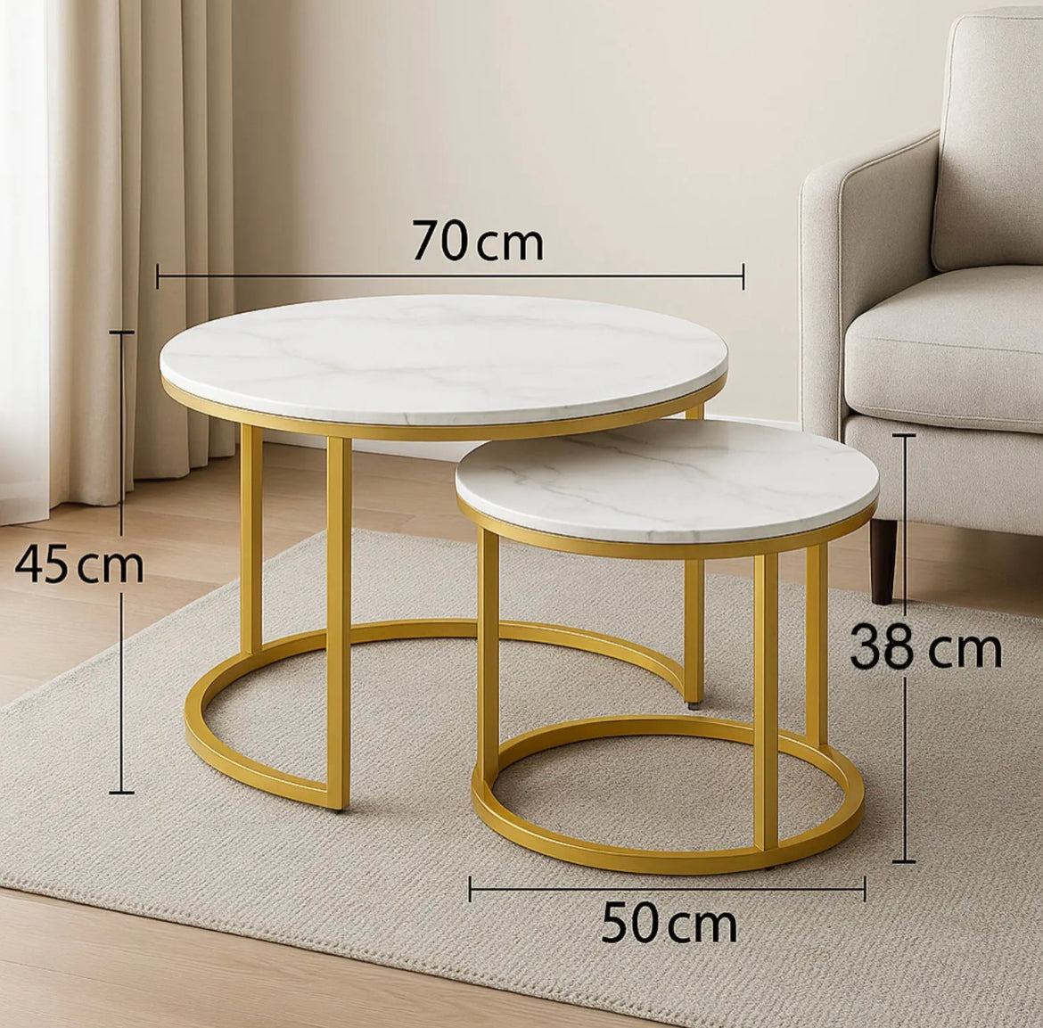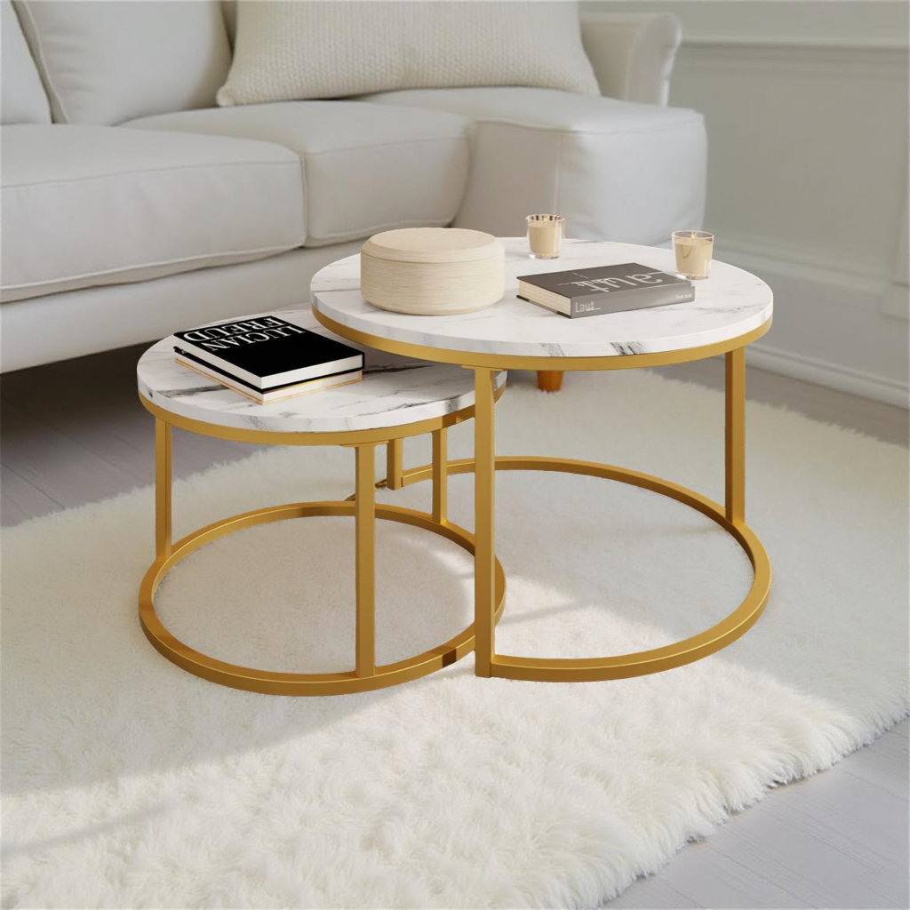 Bijela mramorna ploča i zlatni metalni okvir daju profinjen izgled, dok se manji stolić uredno sprema ispod većeg – savršeno za pametno korištenje prostora.